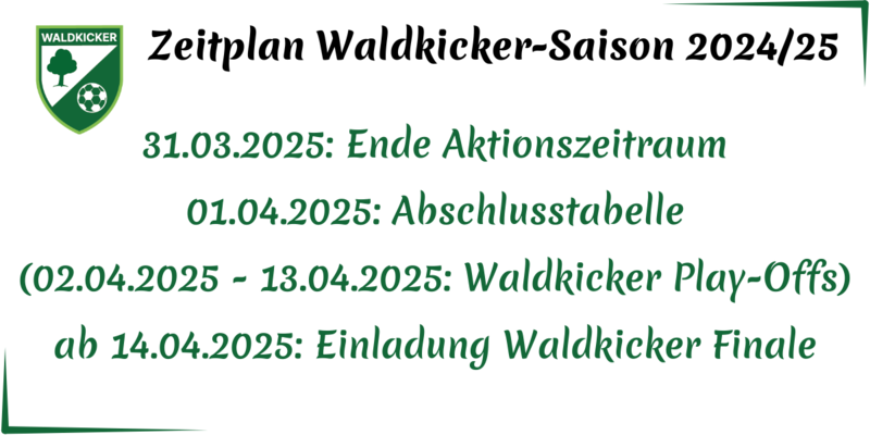 Am 01.04.2025 um 17 Uhr werden wir die finale Abschlusstabelle veröffentlichen. - 02.04.2025 - 13.04.2025: Waldkicker Play-Offs